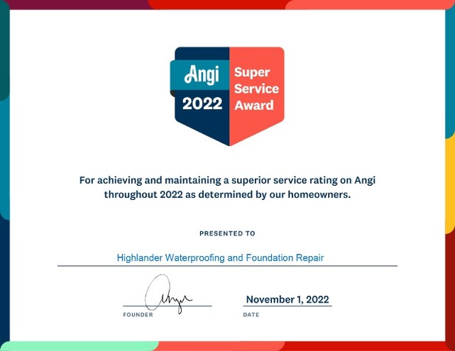 PRESS RELEASE: Mars, PA, 11/21/2022– Highlander Waterproofing and Foundation Repair is proud to announce that it has earned the home service industry’s coveted Angi Super Service Award (SSA). This award, first released in 1999, recognizes the best home professionals and businesses in the Angi network for their hard work, dedication, and commitment to providing Angi customers a great experience.